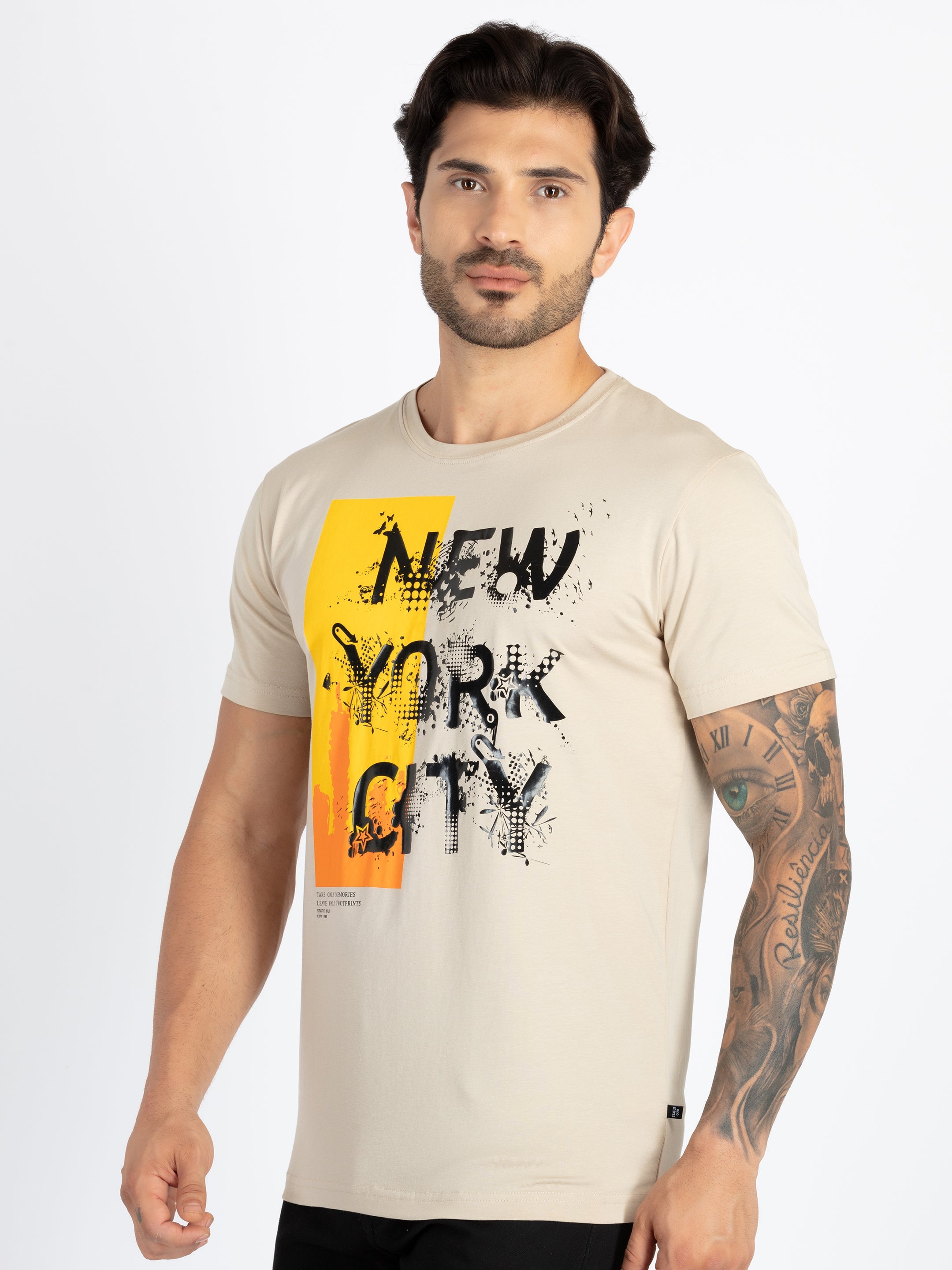 BEIGE Printed T-Shirt Has Round Neck, Half Sleeves