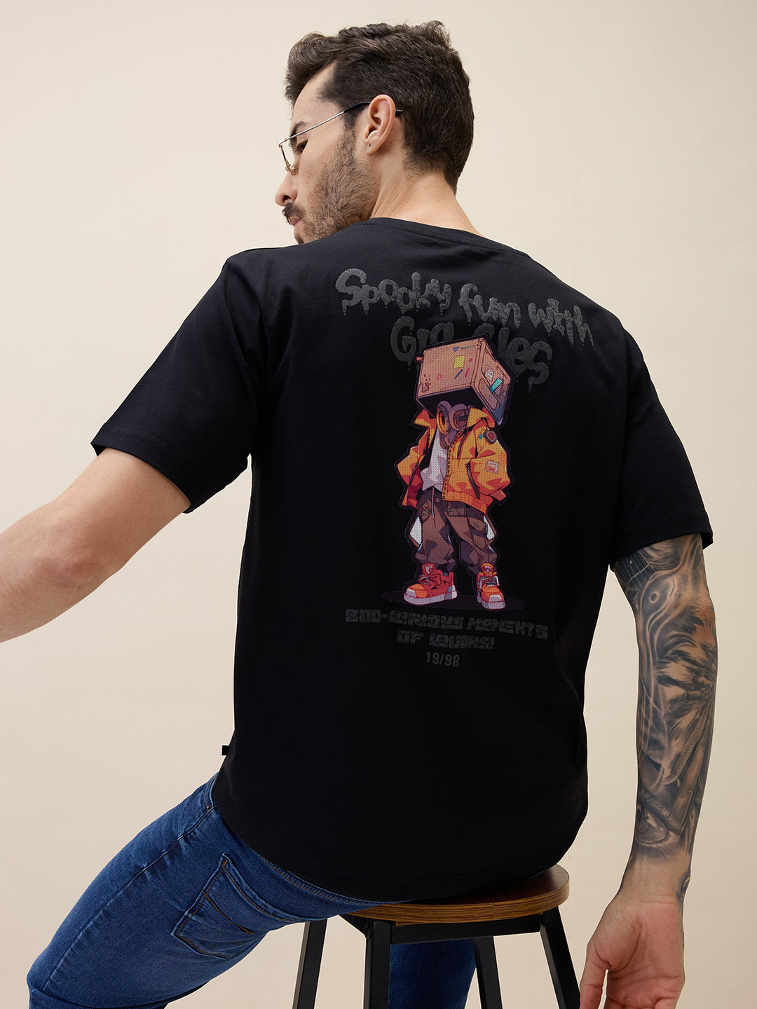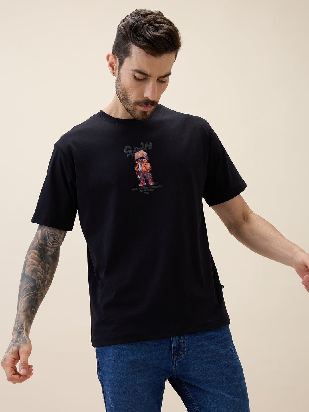 BLACK Men's Printed Round Neck Half Sleeves Oversized Tshirt