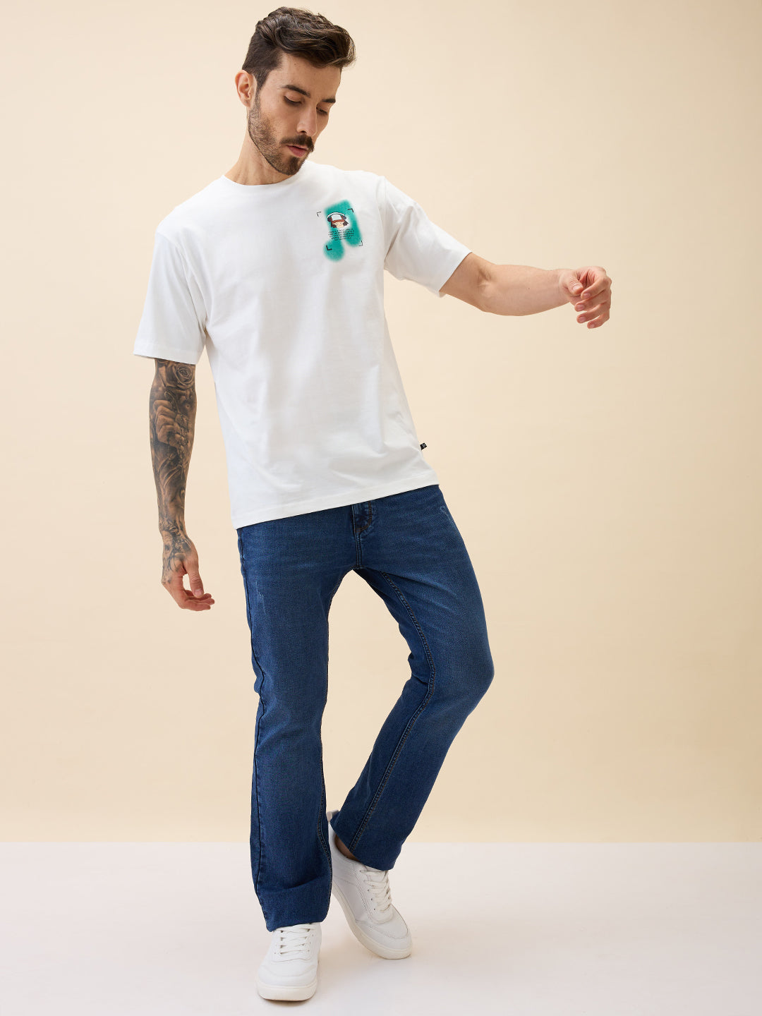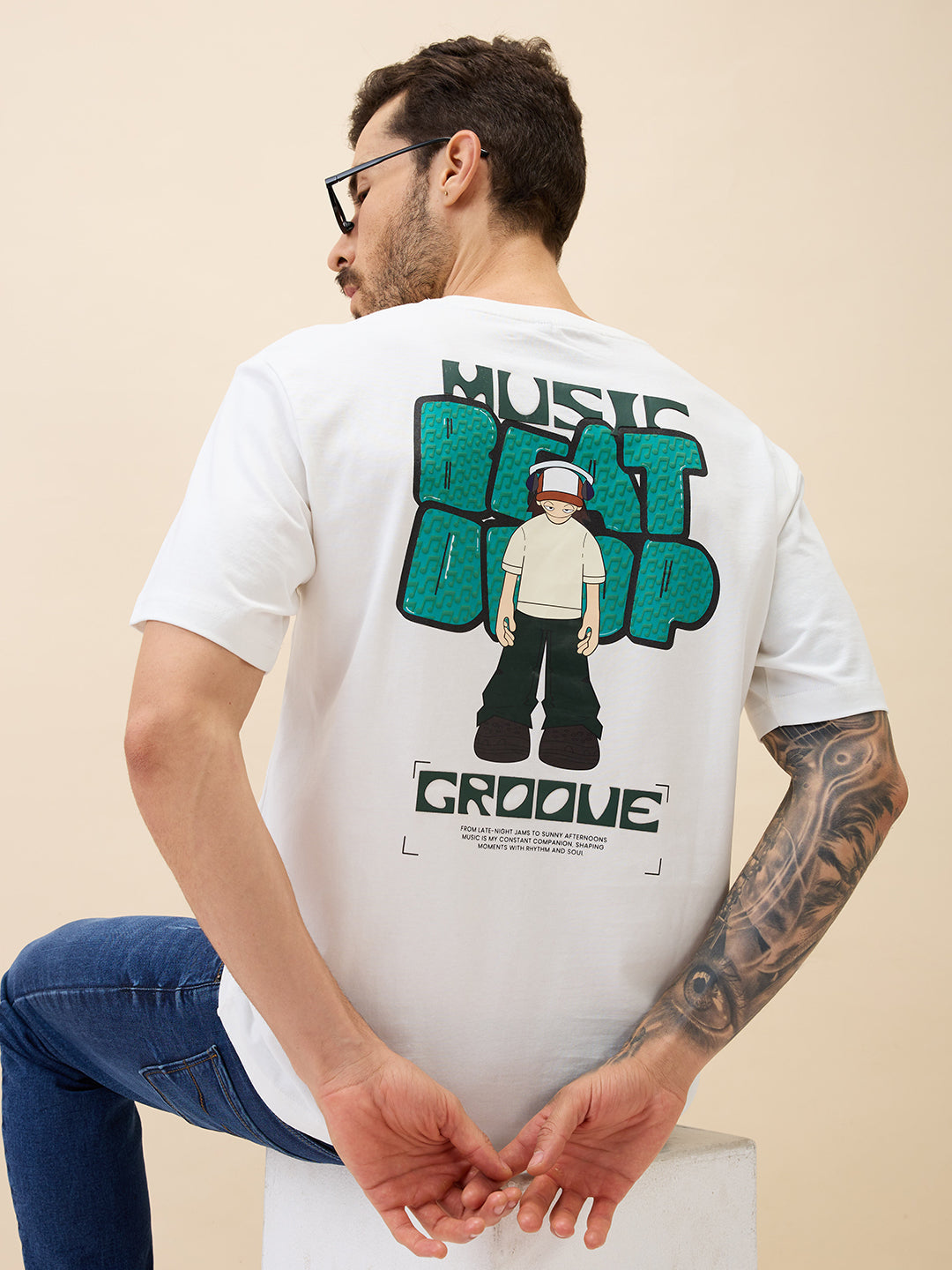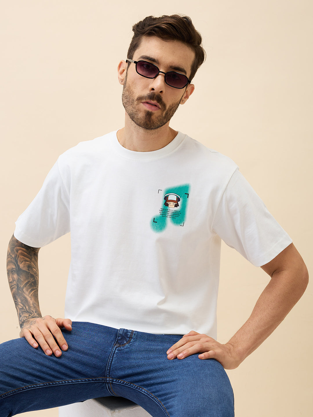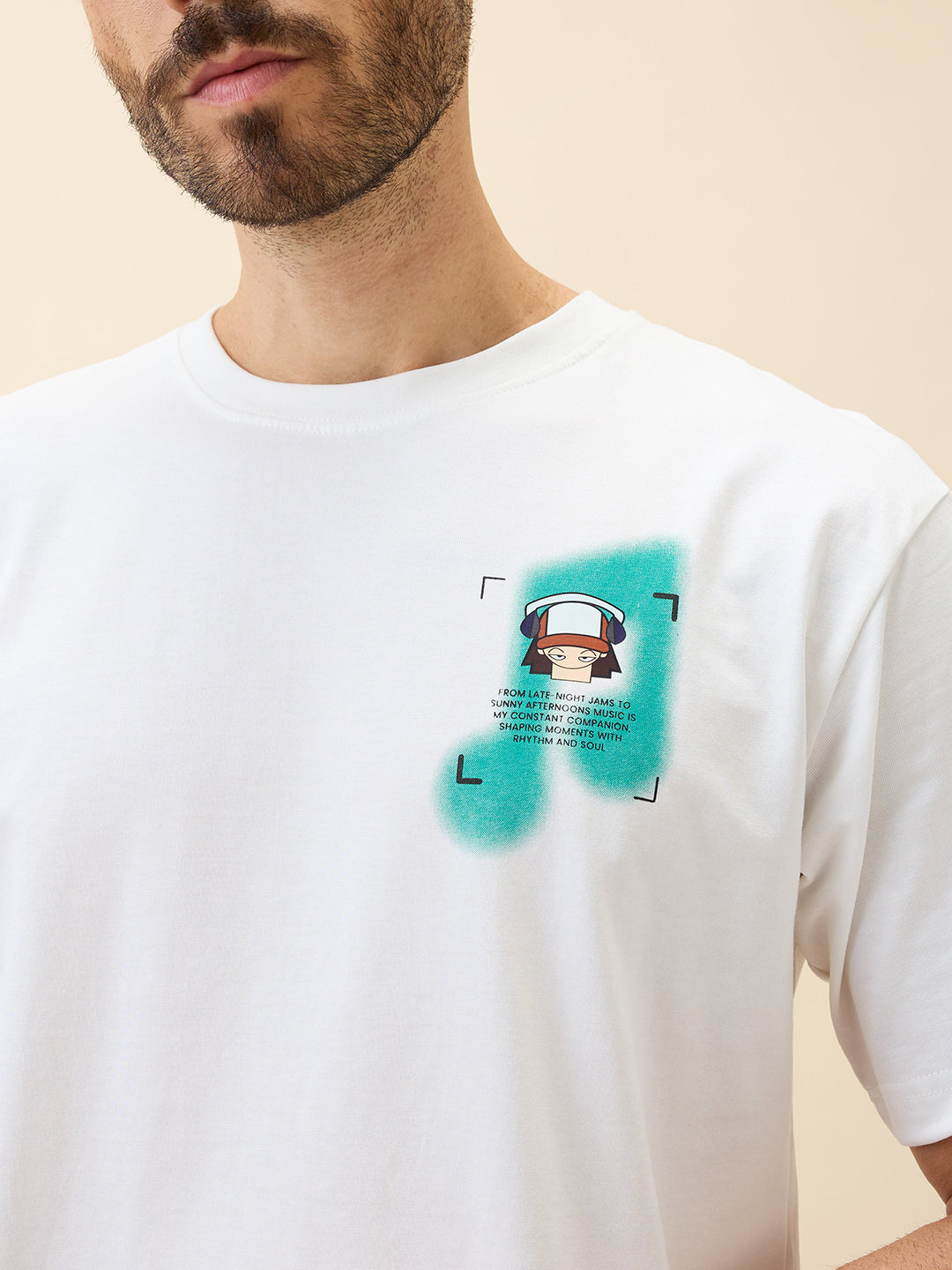 WHITE Men's Printed Round Neck Half Sleeves Oversized Tshirt
