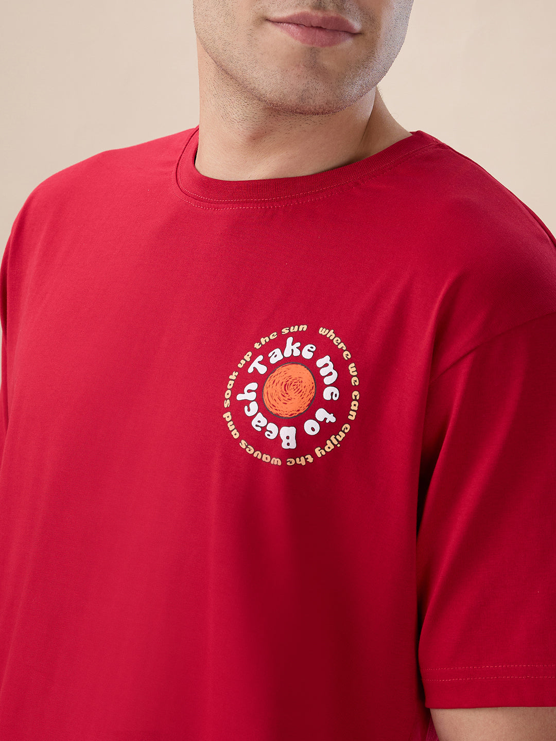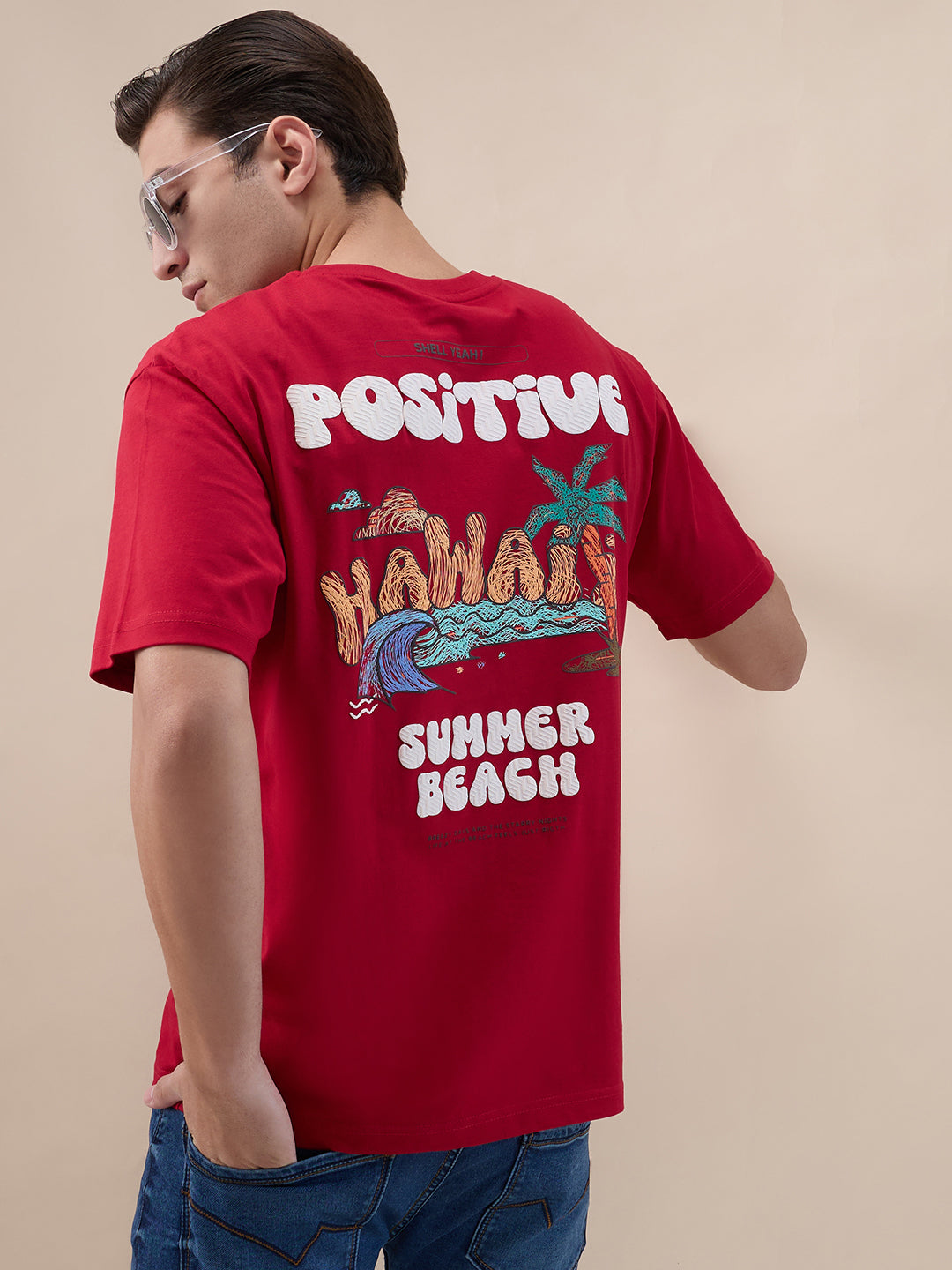 MAROON Men's Oversized Half Sleeves Round Neck T-shirt with Back Typography Print
