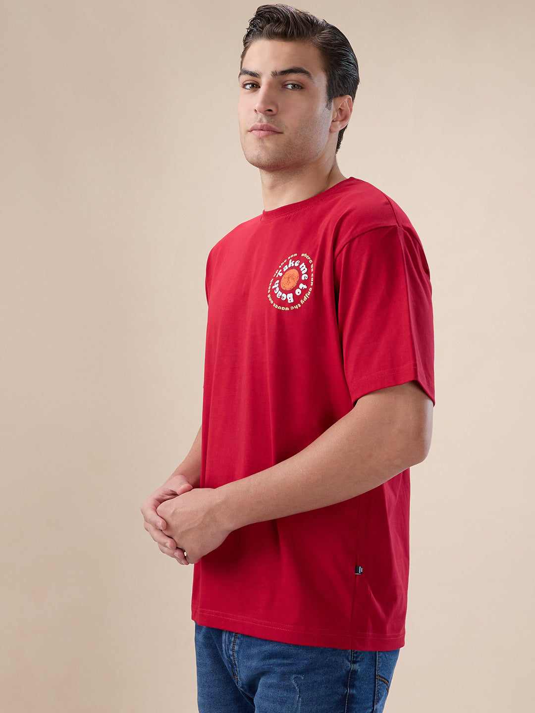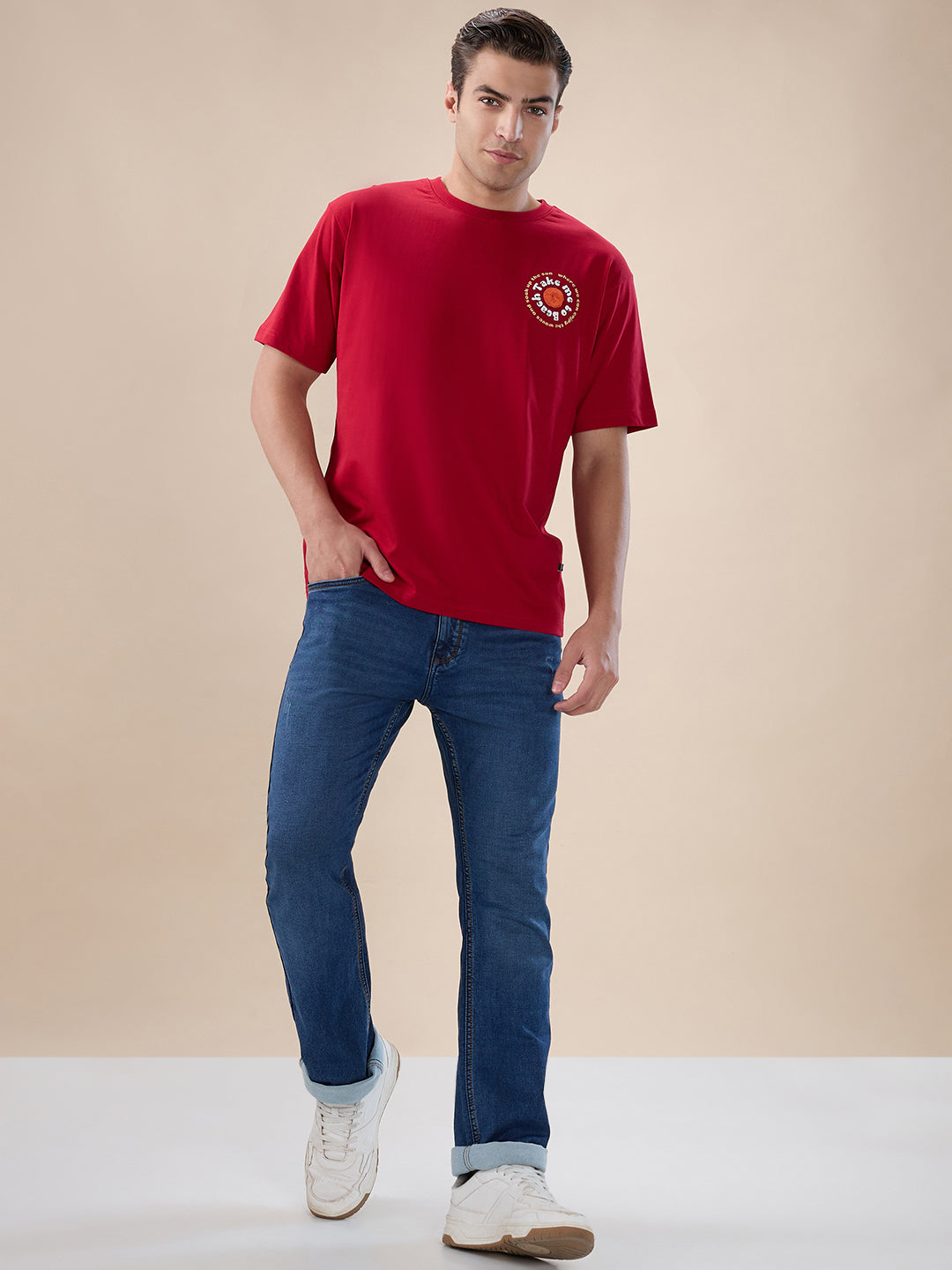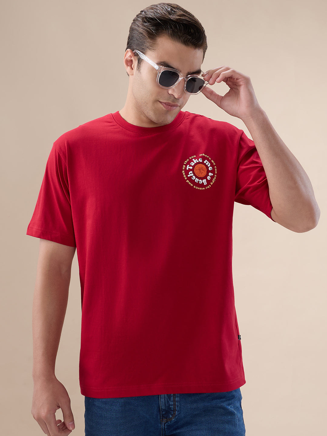 MAROON Men's Oversized Half Sleeves Round Neck T-shirt with Back Typography Print
