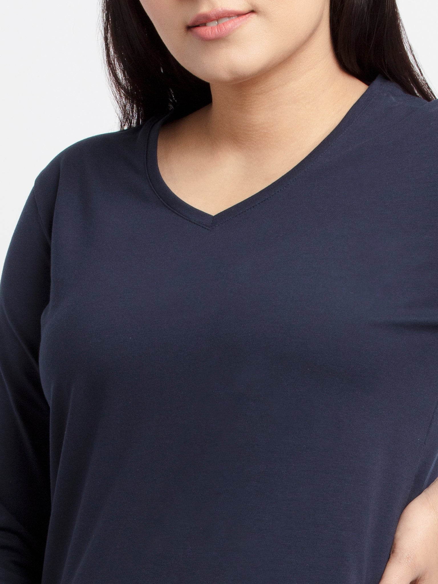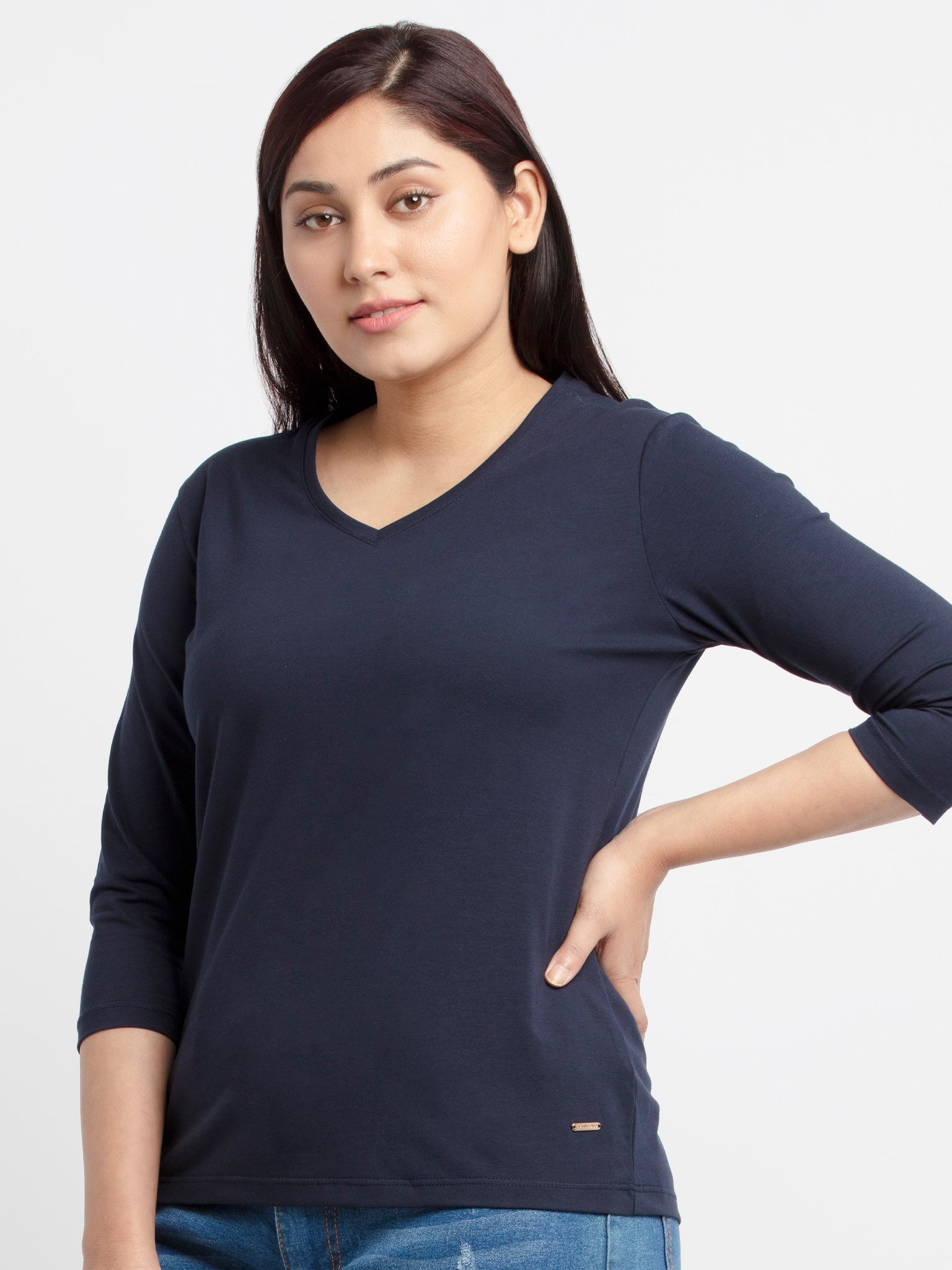 Navy Basic V Neck T-Shirt has V Neck, 3/4th Sleeves .