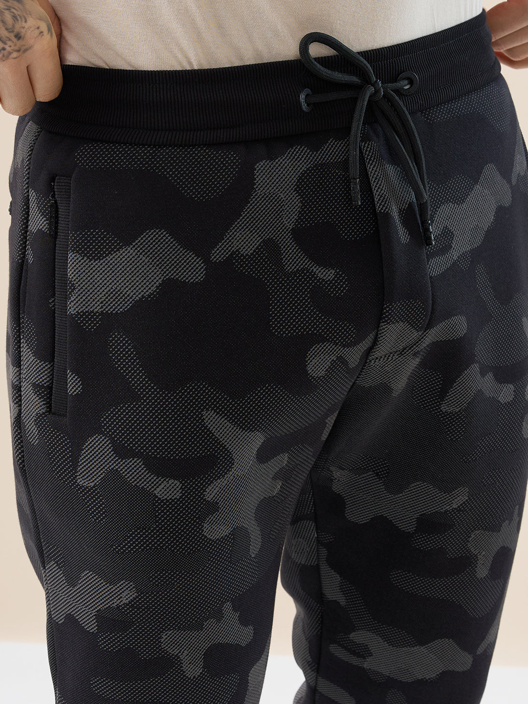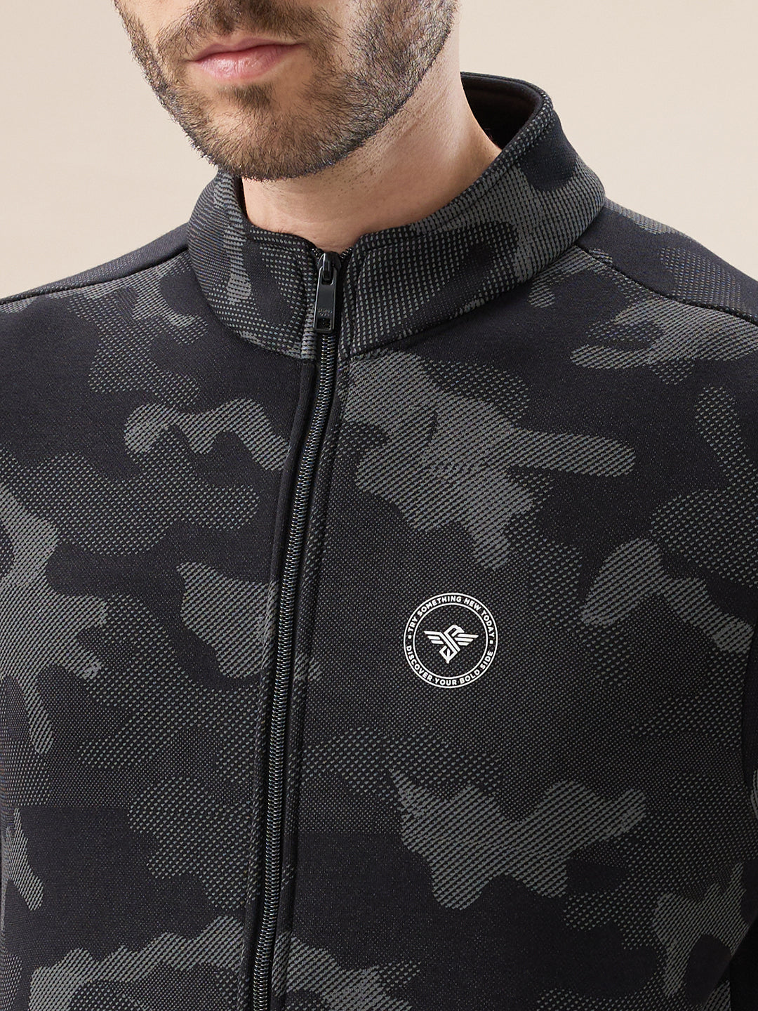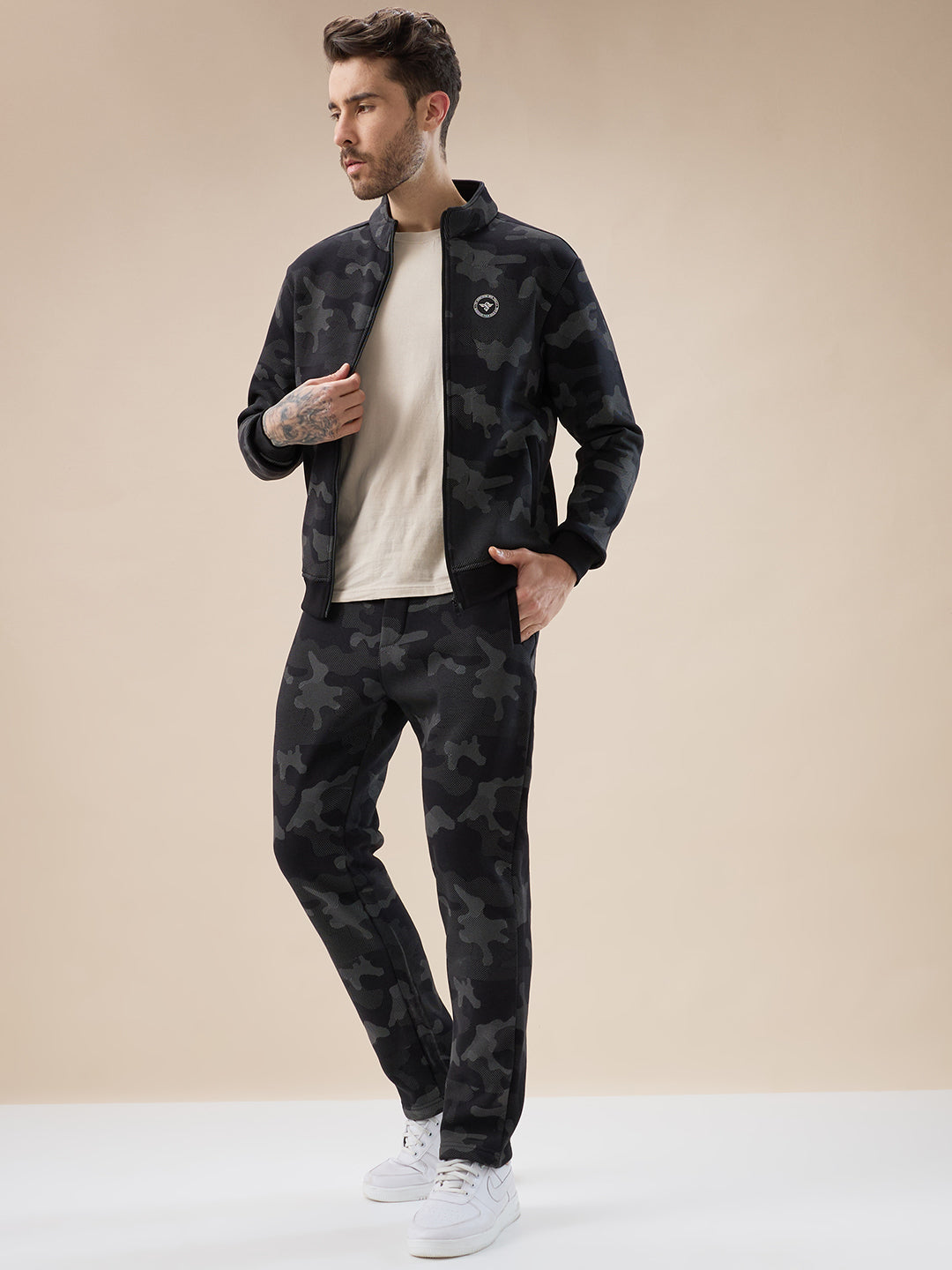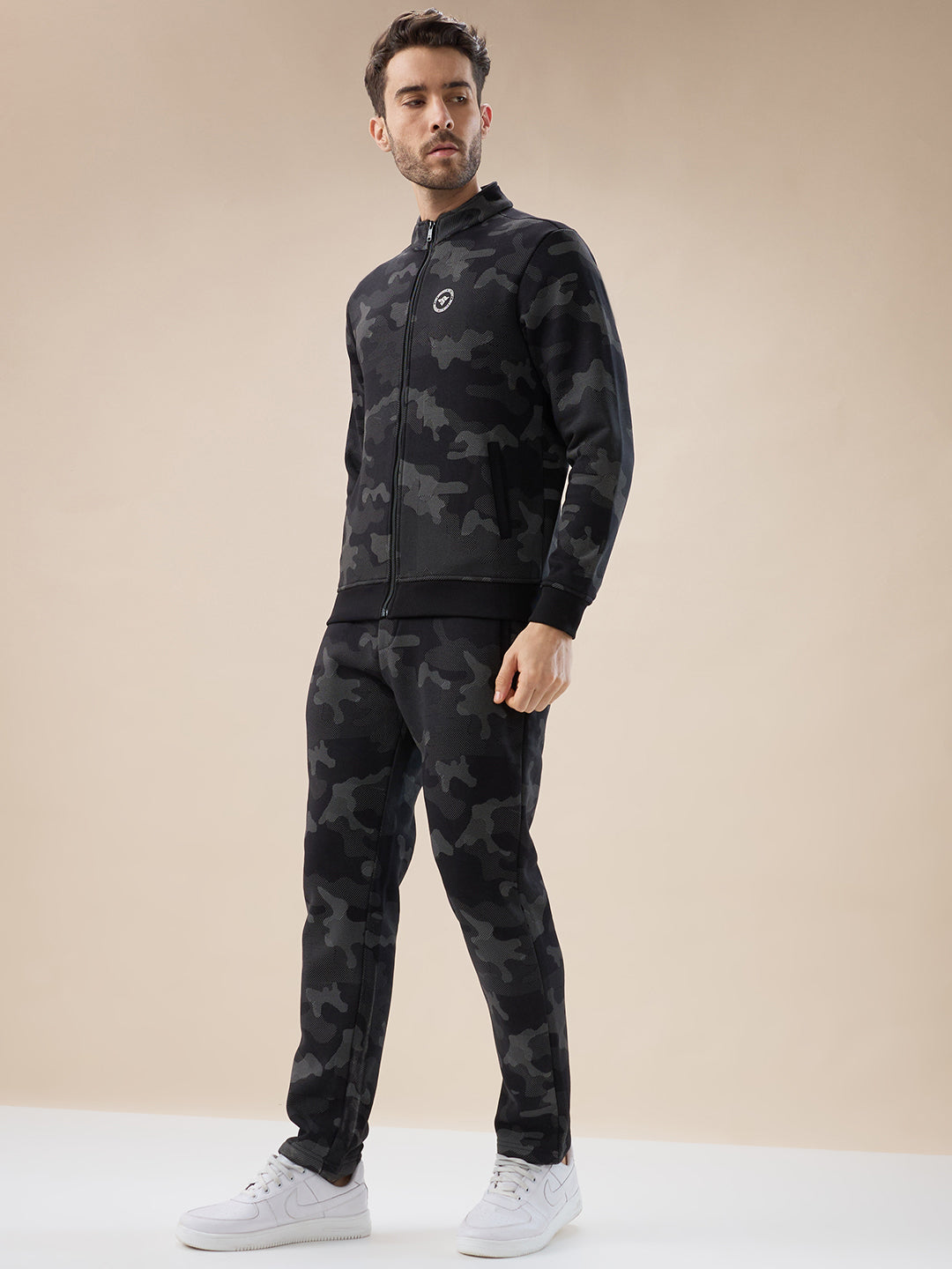 BLACK Men's Camouflage Print High Neck Regular Fit Tracksuit
